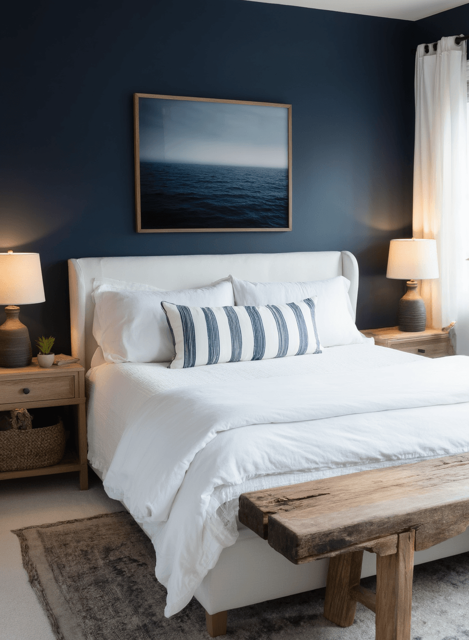 Want to bring the breezy tranquility of a coastal retreat into your own bedroom? This chic, modern nautical bedroom is a perfect blend of navy, natural wood, crisp whites, and soft textures — and it’s easier than ever to recreate the look.
